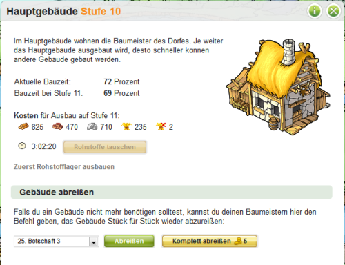 komplett abgerissen werden. Dazu öffnest du das Hauptgebäude, wählst aus dem drop-down Menü das entsprechende Gebäude aus und klickst anschließend auf "Komplett abreißen". Es erscheint noch eine kurze Abfrage, ob du dir sicher bist, dieses Gebäude abzureißen und wenn du dies bestätigst, wird das Gebäude aus deinem Dorf entfernt.