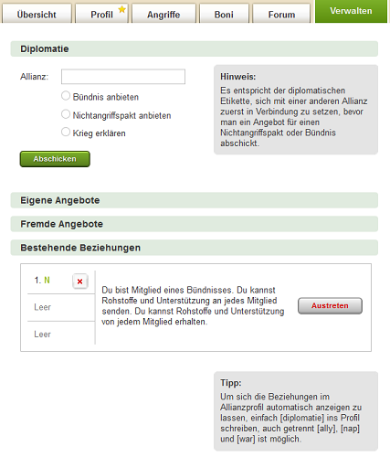 - Allianz A und Allianz B können ein Bündnis schließen, indem die eine der anderen Allianz eine Anfrage schickt und die andere sie annimmt.